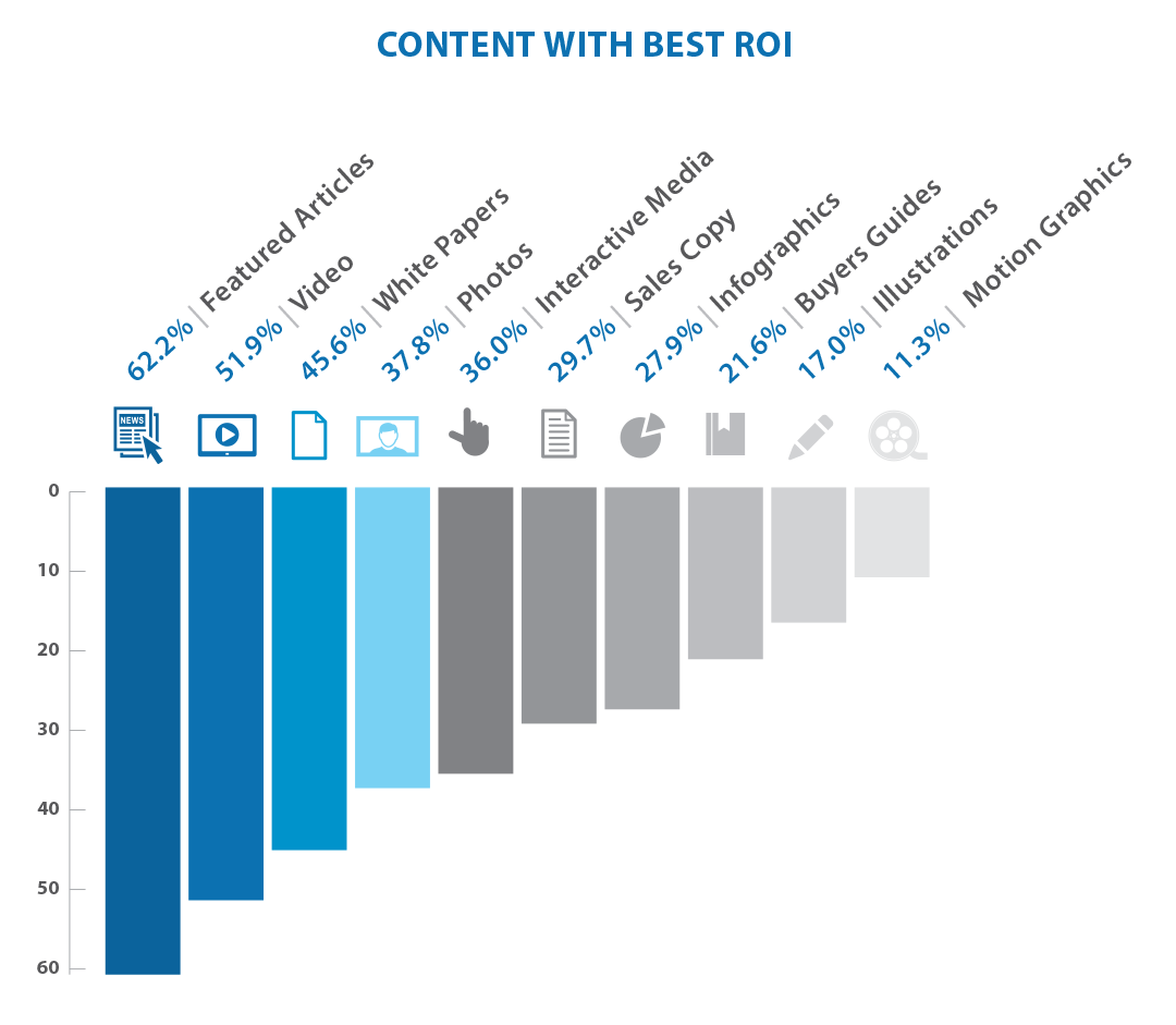 Quali contenuti generano più ROI? E quali sono più difficili da realizzare? Alla prima domanda gli intervistati hanno risposto così: i guest post (62,2%), i video (51,9%), i white paper (45,6%), le foto con il (37,8%) e le infografiche (27%). I più complessi da realizzare sono i video (49,8%), i media interattivi (43,1%) e le infografiche (32%). Video (50,4%), media interattivi (38,3%), motion graphic (27,7%) e infografiche (19,1%) sono invece i più costosi.